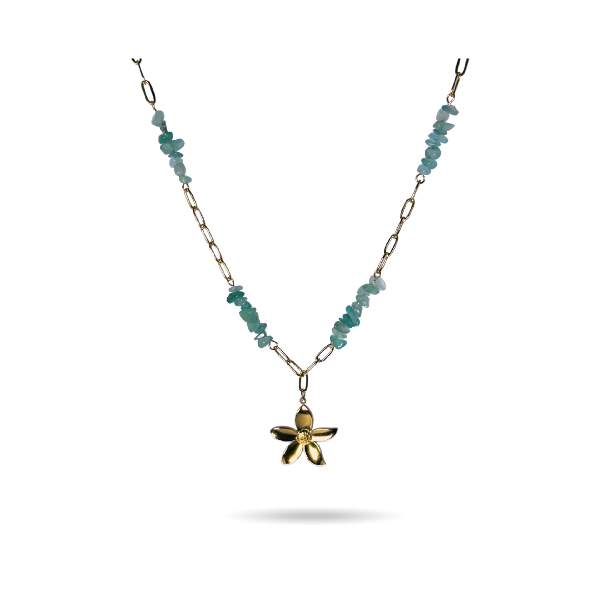 This necklace features a golden flower pendant crafted from cowrie shells. It is adorned with natural blue and green chip beads (possibly turquoise or similar stones) and hangs from a sturdy chain, offering a bohemian or beach-inspired style. The combination of natural elements and the detailed flower design makes it a unique and eye-catching accessory.
